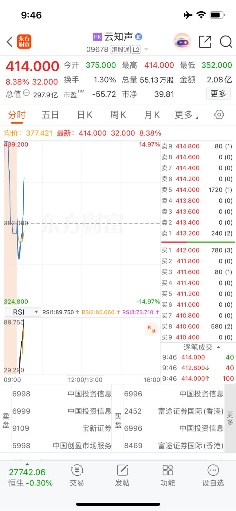 云知声都由水下七个点涨到水上八个点,易点云也跟上。