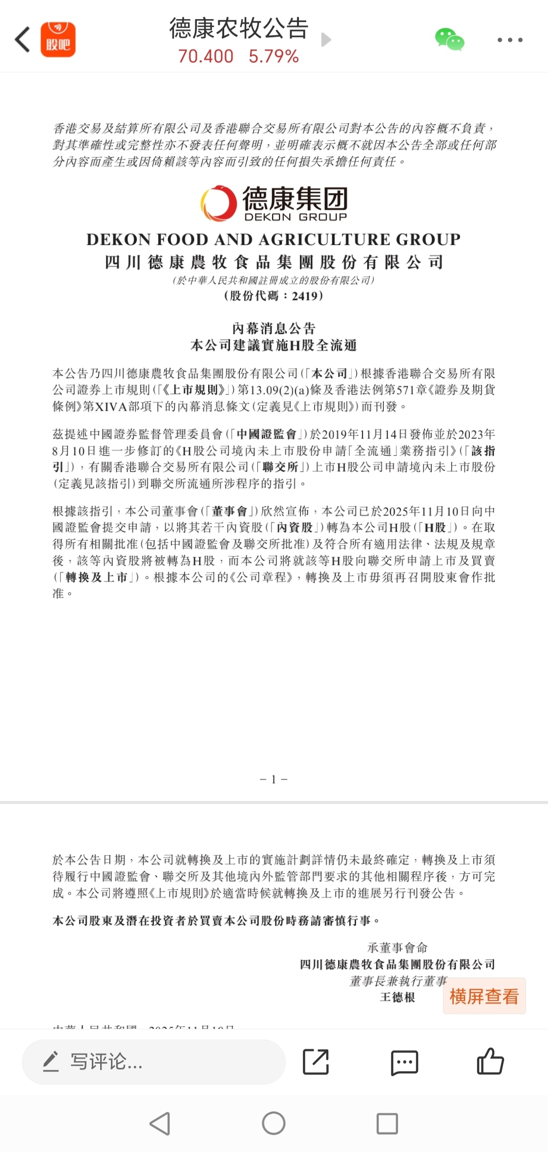 $德康农牧(HK|02419)$ 11月10日刚提交新一轮H股全流通申请,当天股价就涨了5.79%,这波上涨可不是瞎涨,一方面是全流通的利好预期拉着,另一方面行业不那么内卷了,机构也看好它的估值能往上行,这些都是实实在在的支撑。