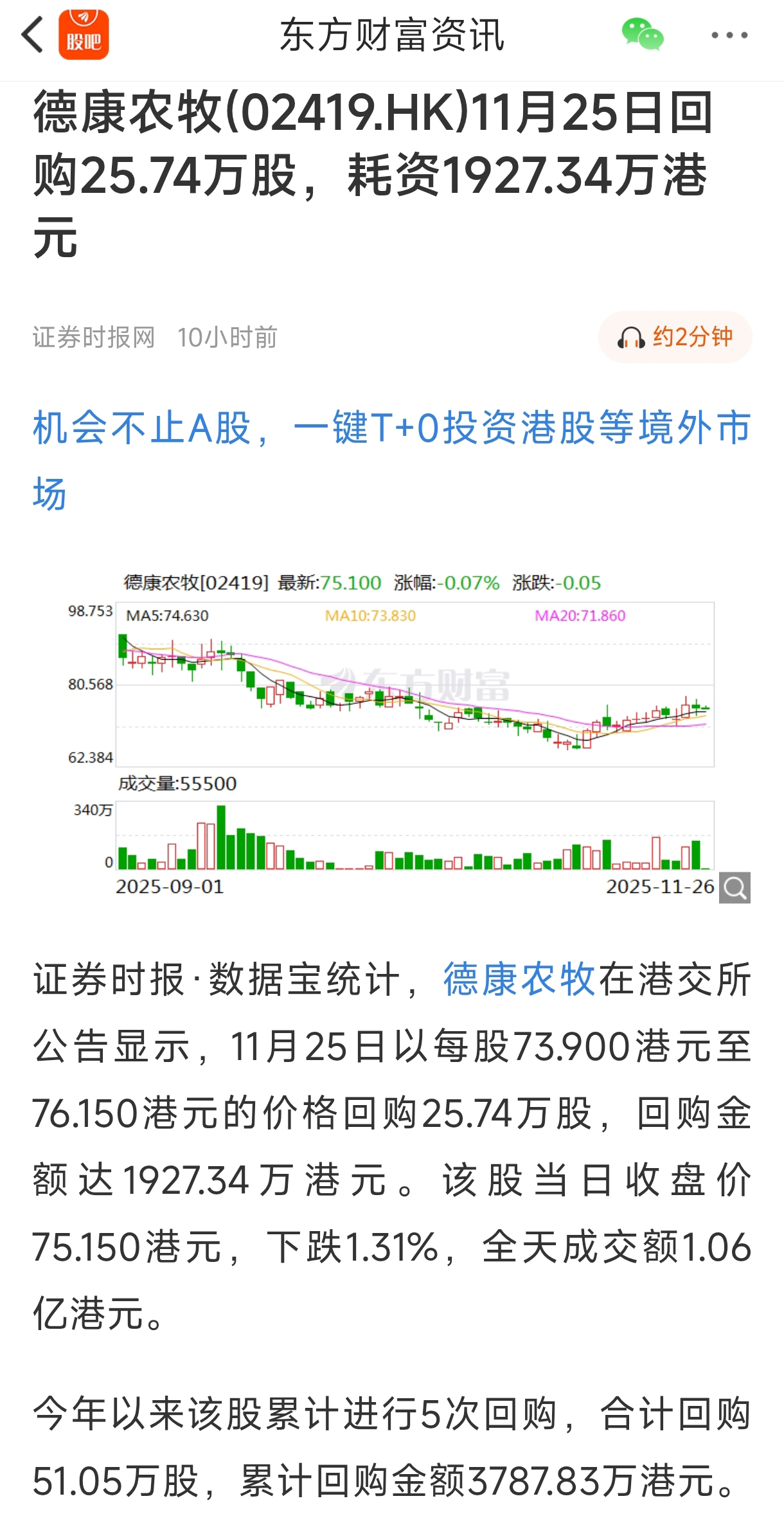 $德康农牧(HK|02419)$ 德康昨天再一次回购1927.34万港元,来个好位置 我再补一仓