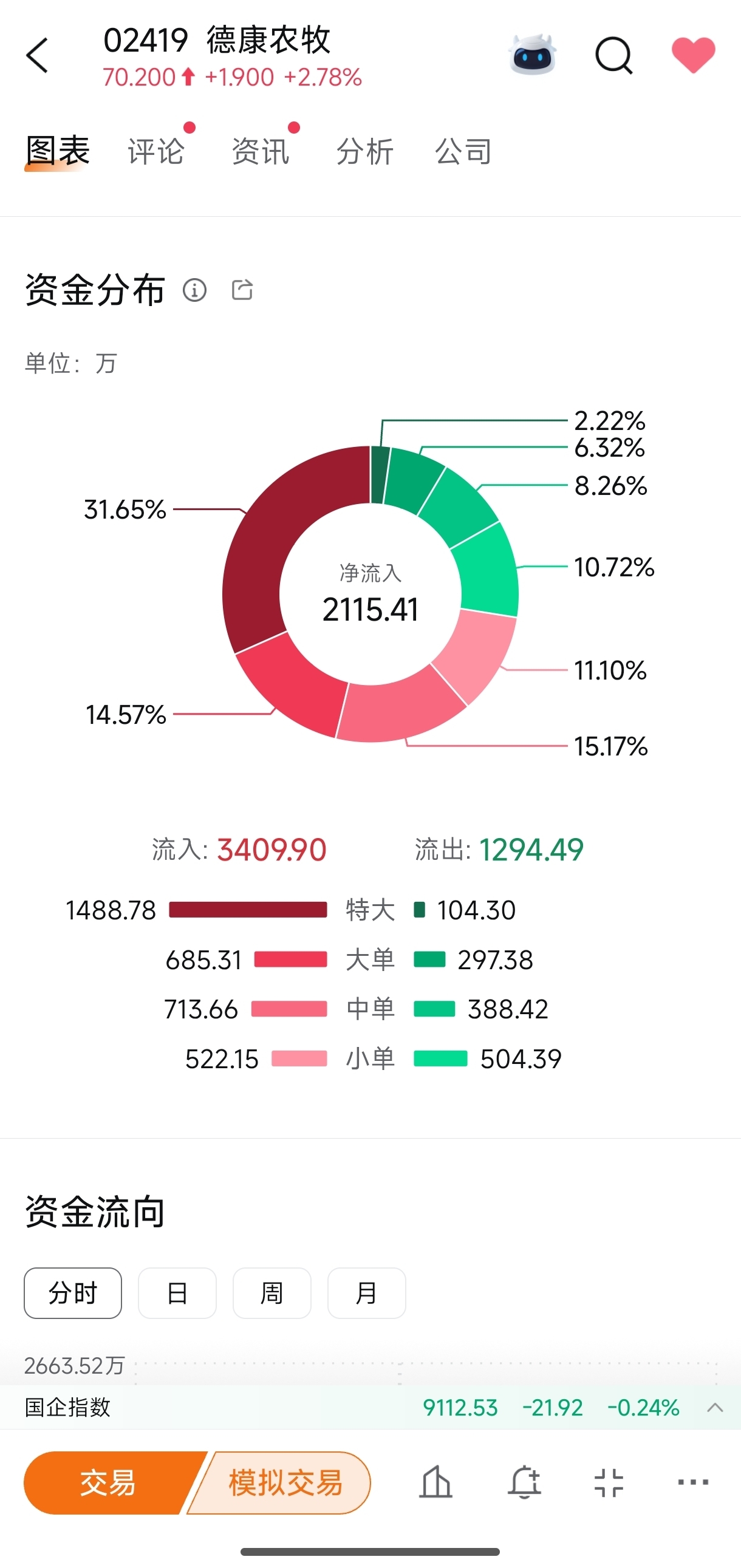 $德康农牧(HK|02419)$ 特大单入场,要发力冲75了