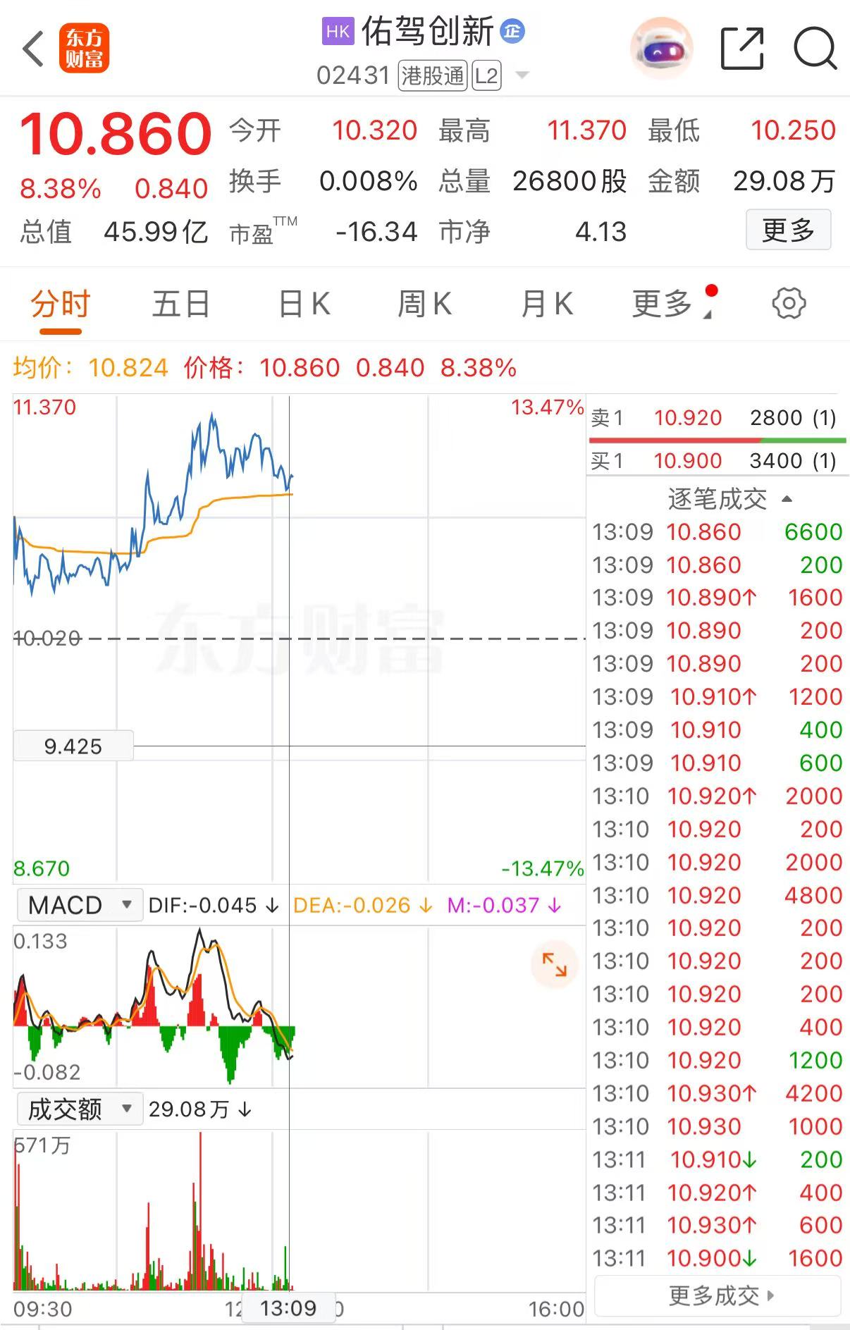 12月16日,佑驾创新震荡走高,盘中一度涨超13%,最高报11.37港元/股。截至13时09分,佑驾创新涨8.38%,报10.86港元/股。