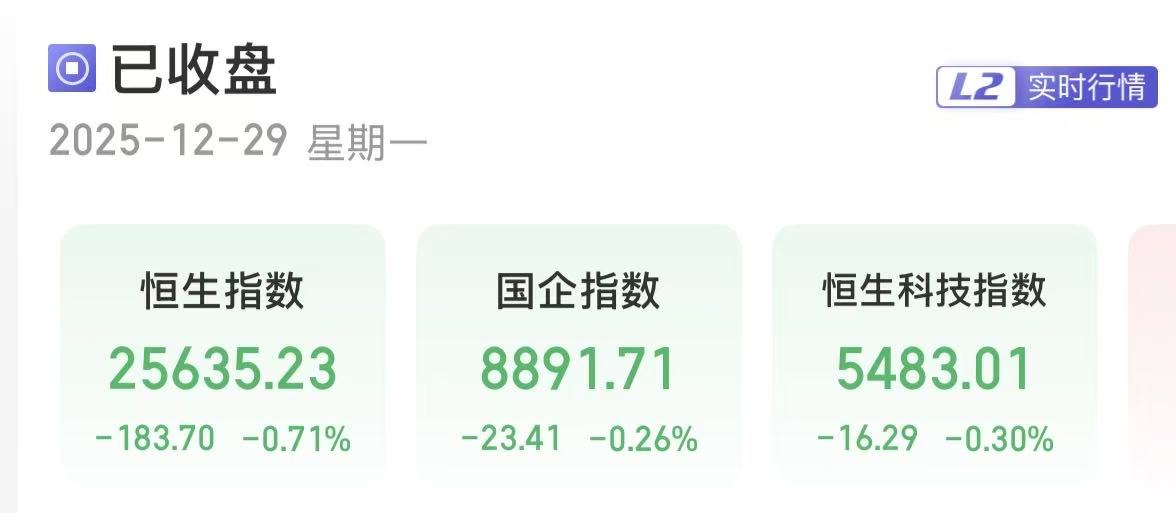 上证报中国证券网讯(刘禹希记者严晓菲)12月29日,港股三大指数收跌。截至收盘,恒生指数跌0.71%,报25635.23点;恒生国企指数跌0.26%,报8891.71点;恒生科技指数跌0.3%,报5483.01点。