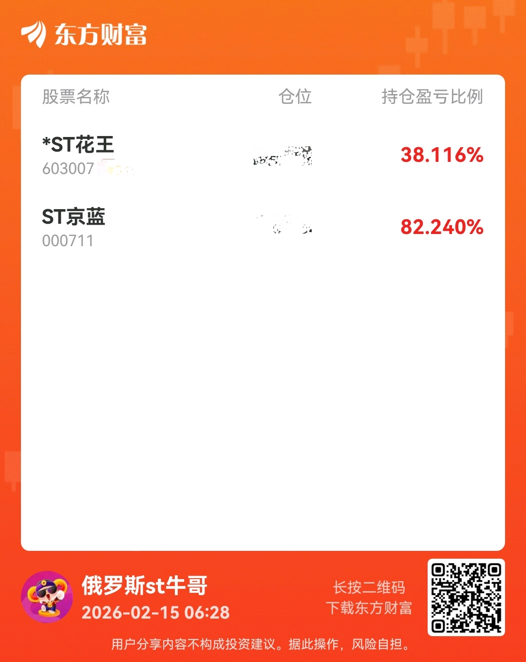 $*ST花王(SH603007)$ $*ST铖昌(SZ001270)$ $ST京蓝(SZ000711)$ A股前三重仓股花王+京蓝+铖昌!花王成本会比实际成本价低0.3元,因为牛哥参与第四次拍卖数量多,机器人概念年后必炒,布局了机器人花王,越疆,优必选,英诺赛科+速腾聚创!