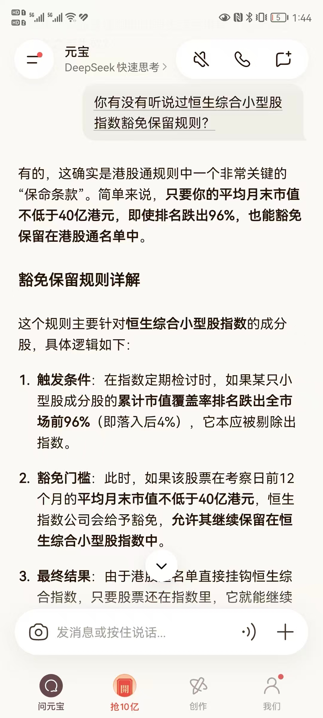 $粉笔(HK|02469)$ 各位,我问了千问,灵光,豆包,元宝等ai,一开始问的是排名低于96%但平均月末市值50亿,元宝告诉会退通,其他都说不退通,然后我再问元宝,你有没有听说过恒生综合小型股指数豁免保留规则,然后元宝改口了,说不退通,大家去搜搜看。
