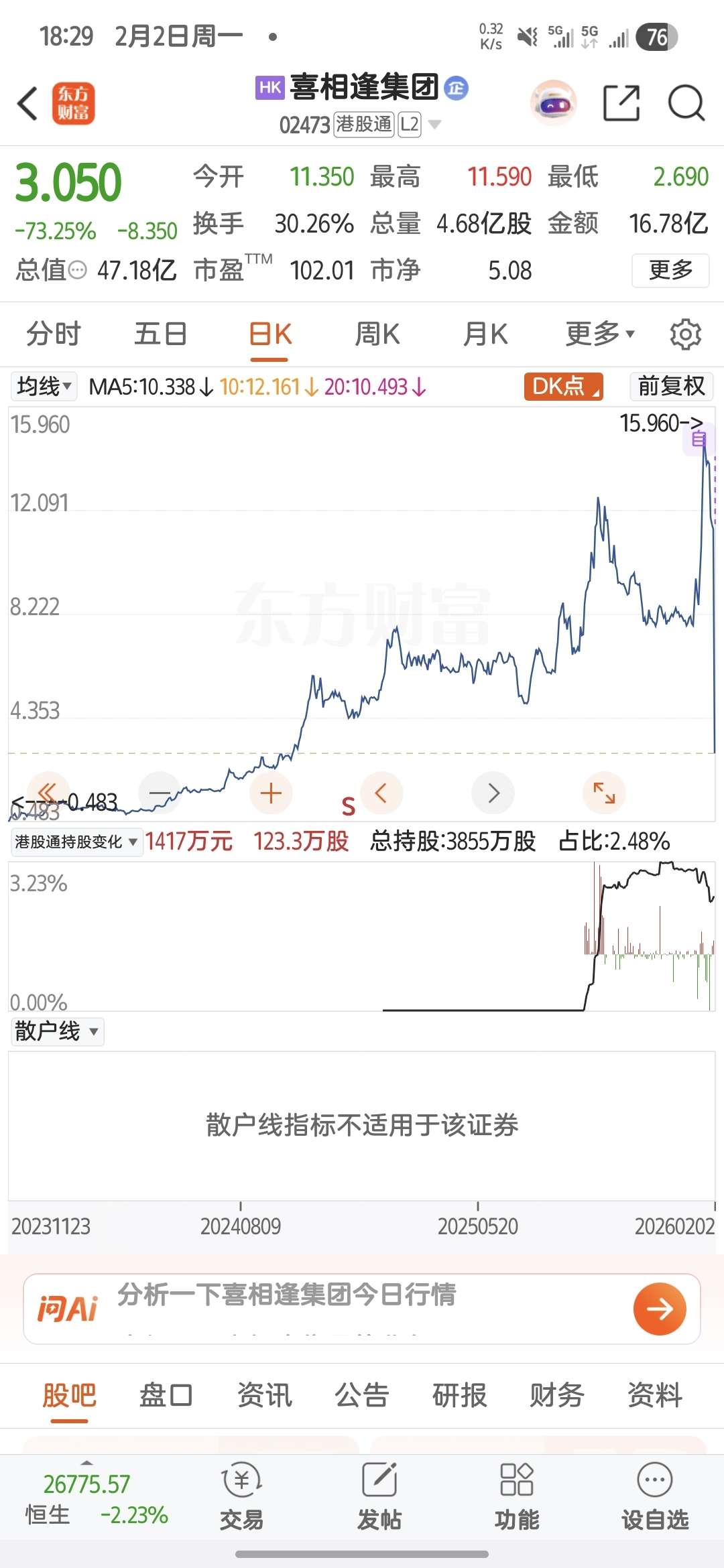 $喜相逢集团(HK|02473)$ 前复权的走势