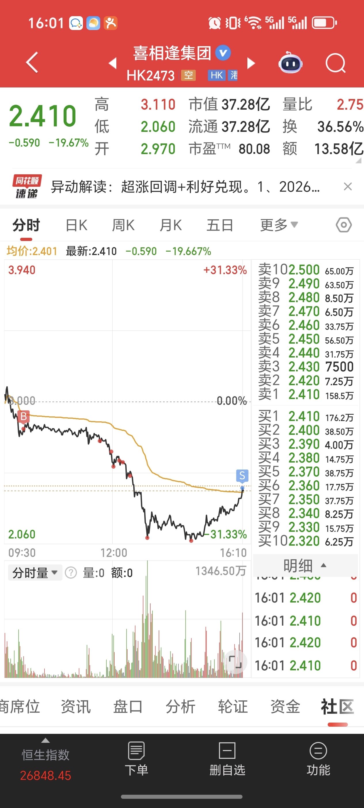 $喜相逢集团(HK|02473)$ 爽啊,2.06-2.08加了大概半仓,2.43走了,