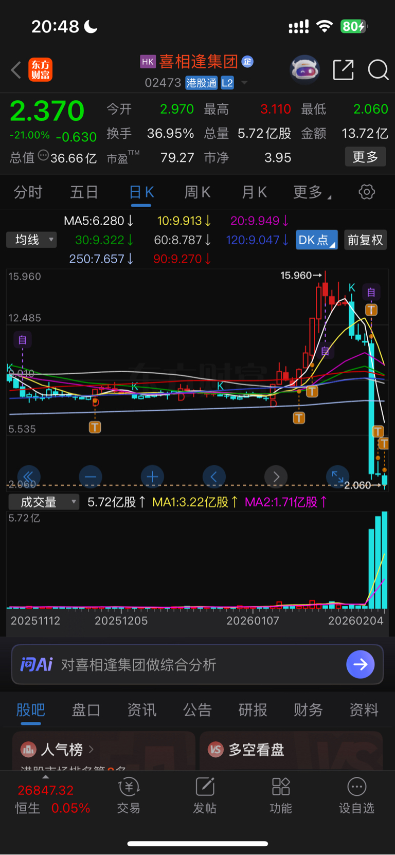 $喜相逢集团(HK|02473)$ 亏发了,只做t,没卖,从高点下来亏了几十个点