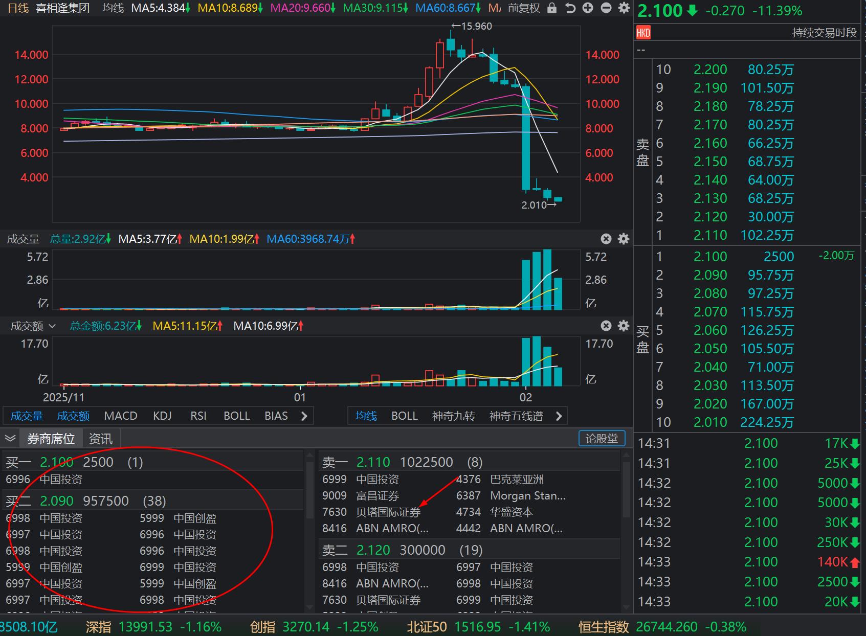 漂亮!我们港股通大败外资股东。全是我们港股通有多少买多少。这个样子没有利空想下破2元没门!