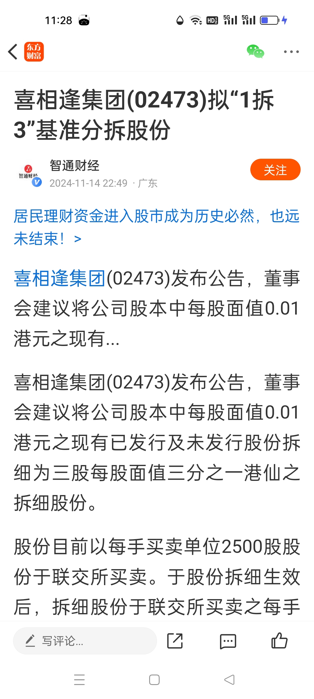 $喜相逢集团(HK|02473)$ 1拆3,现在价格相当于6元,1.3拉上来的,也有5倍涨幅了,别以为现在价格低就可以抄底,港股通老千股最后大部分都是几分一股且没成交量。