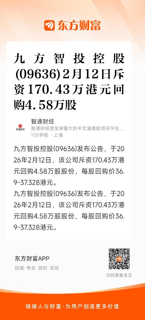 九方智投控股(09636)发布公告,于2026年2月12日,该公司斥资170.43万港元回购4.58万股股份,每股回购价36.9-37.328港元。