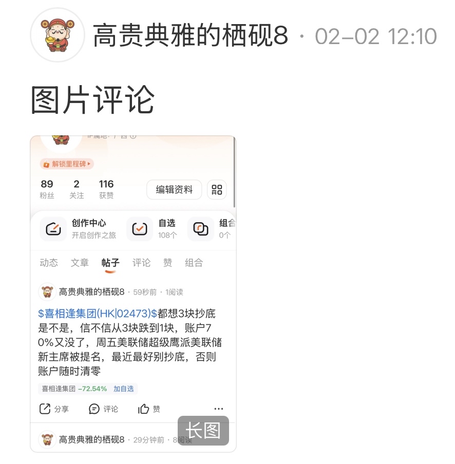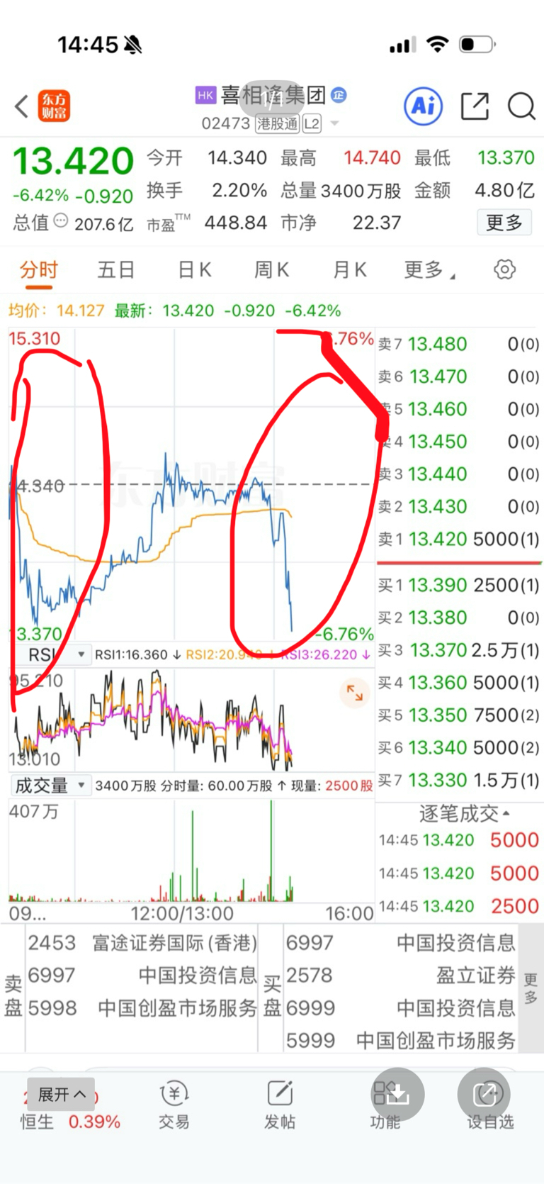 $喜相逢集团(HK|02473)$ 给你们看一下我为什么从一开始就不看好这个股票,我差不多从12月初每天把喜相逢盘面打开,因为我一开始就注意到它了,就这个喜相逢,每天盘中多次突然暴跌8个点,突然暴跌10个点,我就感觉背后操盘的人相当狠毒,为了钱不惜用尽一切手段,如果是你的话你敢买吗?这么多天验证了我的想法,它真的特别狠毒,连跌这么多天一点没有反弹的意思