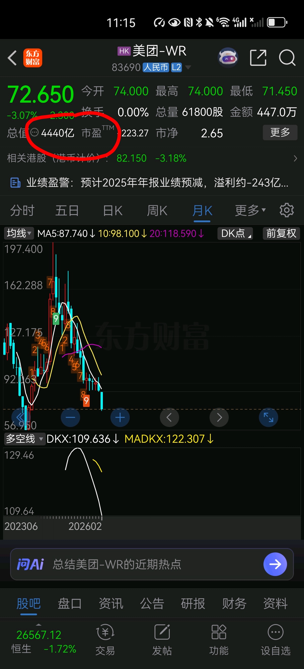 $喜相逢集团(HK|02473)$ 市值高不高?从198跌下来,美团的价格战,美团利润率很薄的,25年亏损200多亿,市值高的可怕,3-4月年报密集区,要是喜相逢没行情,来做年报行情