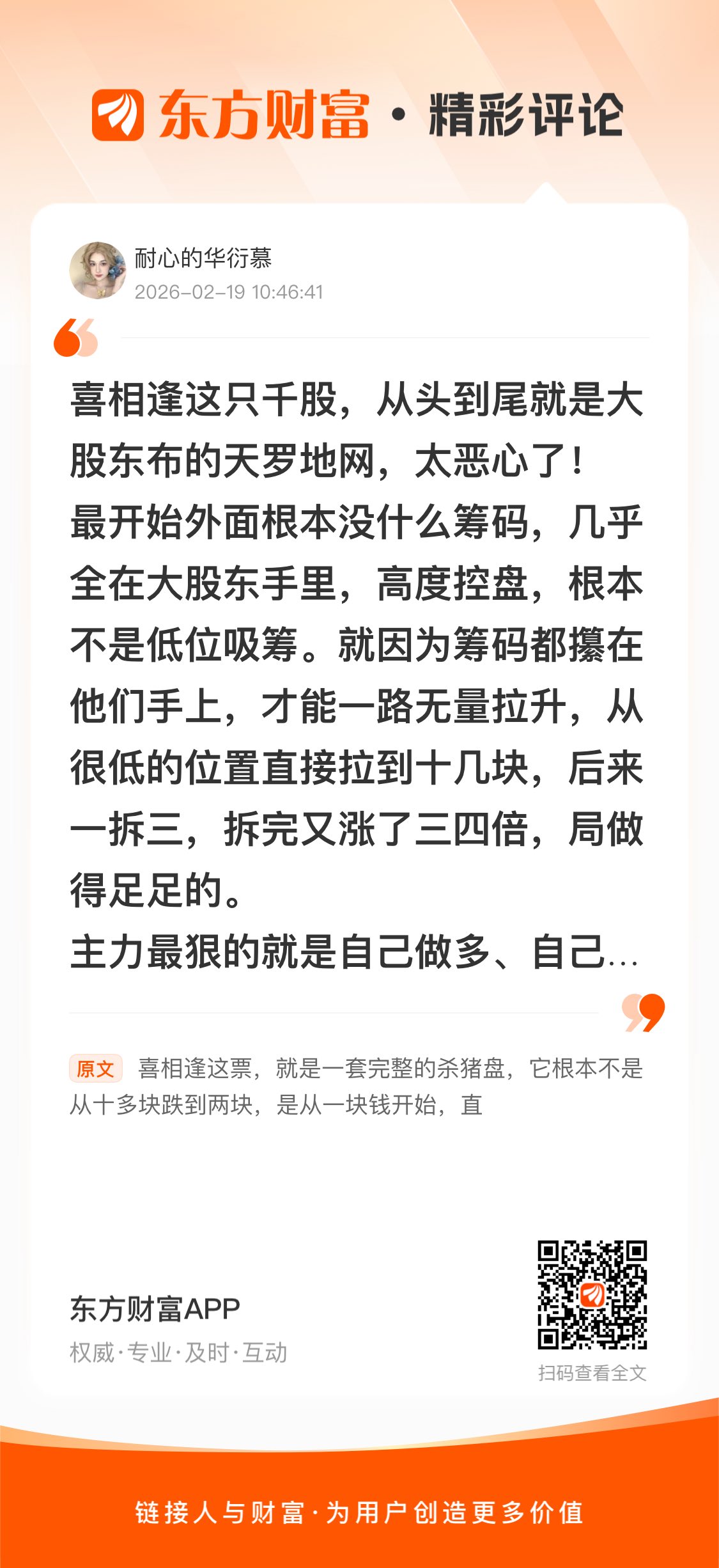 //@耐心的华衍慕 : 喜相逢这只千股,从头到尾就是大股东布的天罗地网,太恶心了!最开始外面根本没什么筹码,几乎全在大股东手里,高度控盘,根本不是低位吸筹。就因为筹码都攥在他们手上,才能一路无量拉升,从很低的位置直接拉到十几块,后来一拆三,拆完又涨了三四倍,局做得足足的。主力最狠的就是自己做多、自己做空,两头吃!高位提前开大量空单,第一波赚差不多7倍,第二波又赚6倍,早就平仓赚得满口流油。现在又在两块左右、两块零几重新开新空单,还故意放一点点1.41的空单数据,数量极少,纯作假迷惑散户。很多散户真的无知,根本看不懂:这几周空单为什么能一直赚那么多,还能安全平仓?盘中动不动就脉冲拉升诱多,可为什么每次到尾盘基本上都是绿的?这不诡异吗?这不明显就是主力大股东在搞鬼吗!空单根本不是别人开的,就是大股东、主力自己开的!空单不会砸盘,空单平仓是要买股,反而会拉。真正砸盘的,是他们手里的现货筹码。他们套路就是:先在两块左右开好空单,再用现货把股价砸低,砸到低位自己买回来平仓,就算没散户买,他们自己买回来照样赚差价,空单就是躺赢。再说说他们讲的那些故事,全是用来骗人的!他就是借着收购旷时科技这个消息,把股价暴涨拉了一大波;还有什么无人车合作,路权到现在都还没申请下来呢,纯画饼;收购旷时也只是个故事,根本没实质落地。你们好好想想,如果真的是利好,真的有价值,股价为什么会跌成这样?为什么会跌这么多?这还不够明显吗?利好就是用来出货、用来开空单的工具!现在股票全流通了,筹码一大半都倒给了散户和港股通,散户占比快一半了。节内散户少、没流动性,主力趁机再拉一波,根本不是真涨,就是为了在更高位开新空单,节后继续用现货砸盘收割。明摆着就是一只千股,从头到尾都是局:高度控盘→无量拉升→借收购旷时、无人车故事暴涨诱多→高位开空+高位出货→脉冲诱多、尾盘砸绿→用现货砸盘赚空单钱→最后全是散户接盘。空单就是大股东自己开的,这就是真相!