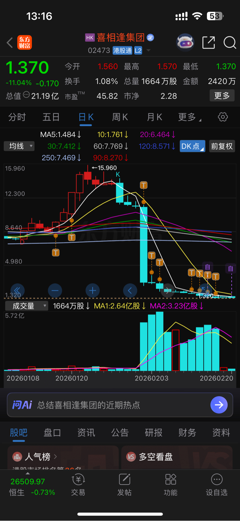 $喜相逢集团(HK|02473)$ 虽然我基本满仓,但是成本1.3,我还是来看1元