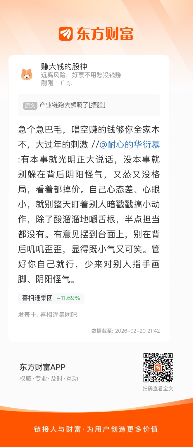 急个急巴毛,唱空赚的钱够你全家木不,大过年的刺激 //@耐心的华衍慕 :有本事就光明正大说话,没本事就别躲在背后阴阳怪气,又怂又没格局,看着都掉价。自己心态差、心眼小,就别整天盯着别人暗戳戳搞小动作,除了酸溜溜地嚼舌根,半点担当都没有。有意见摆到台面上,别在背后叽叽歪歪,显得既小气又可笑。管好你自己就行,少来对别人指手画脚、阴阳怪气。