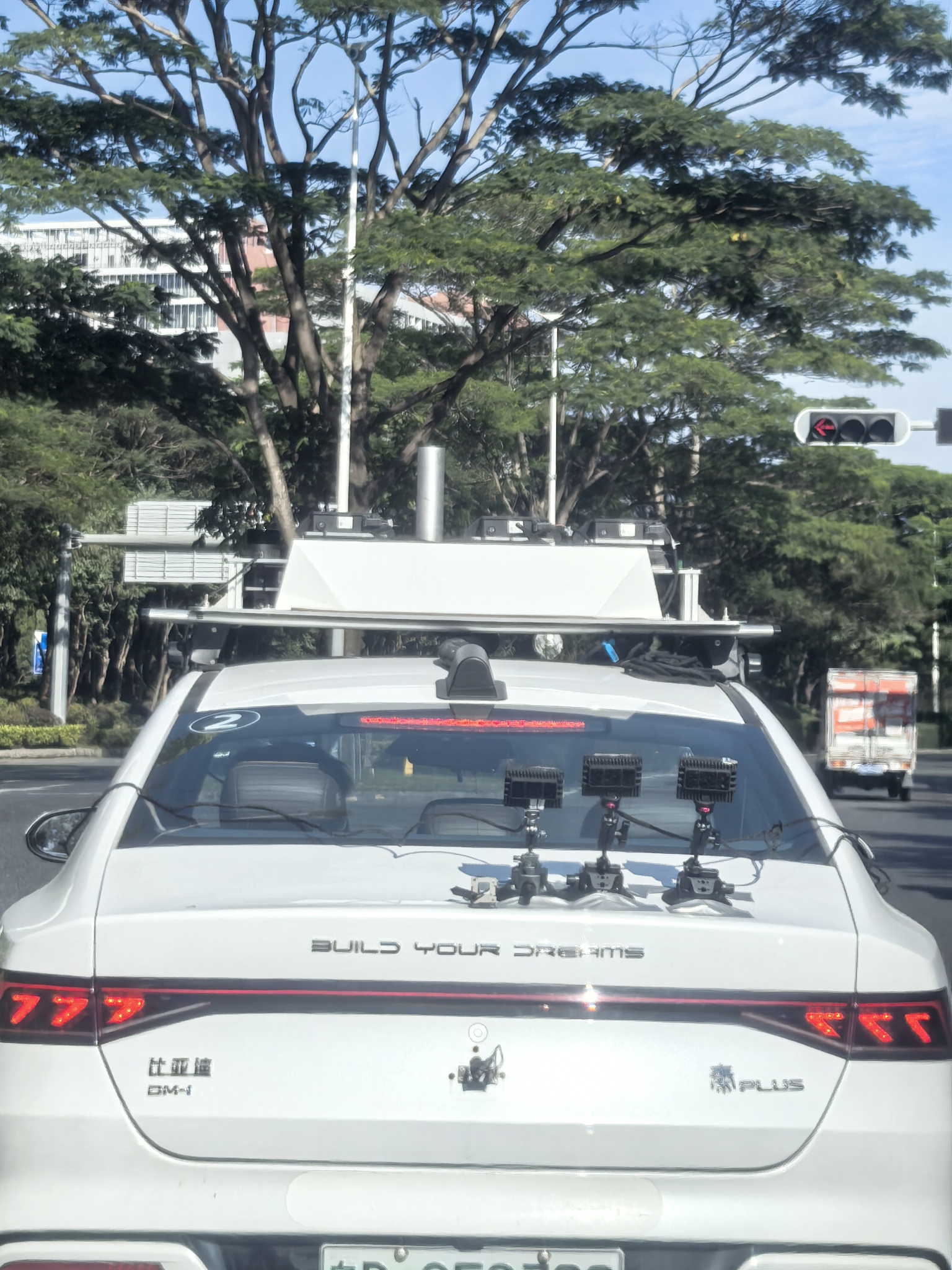 研发方面:确实看到挺多测试车辆和工作人员在调试设备,他们喜欢用比亚迪车子做小白鼠,看到前面那个车上挂满激光雷达的,还从园区跑出来我跟了一阵子,确实在搞测试。