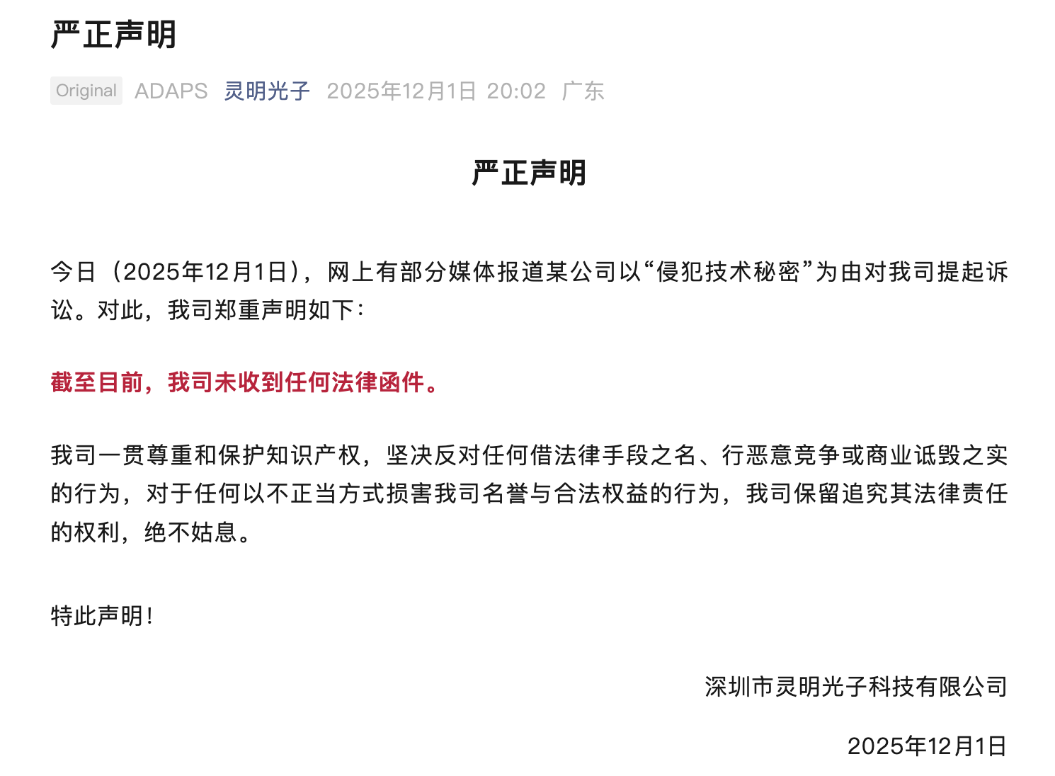 12月1日,深圳市灵明光子科技有限公司发布声明称,今日网上有部分媒体报道某公司以“侵犯技术秘密”为由对公司提起诉讼。截至目前,公司未收到任何法律函件。灵明光子表示,公司一贯尊重和保护知识产权,坚决反对任何借法律手段之名、行恶意竞争或商业诋毁之实的行为,对于任何以不正当方式损害公司名誉与合法权益的行为,公司保留追究其法律责任的权利,绝不姑息。