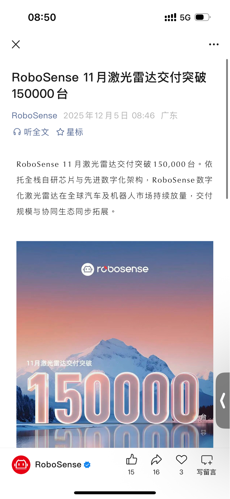$速腾聚创(HK|02498)$ 恭喜恭喜,上个月12万,这个月就15万了
