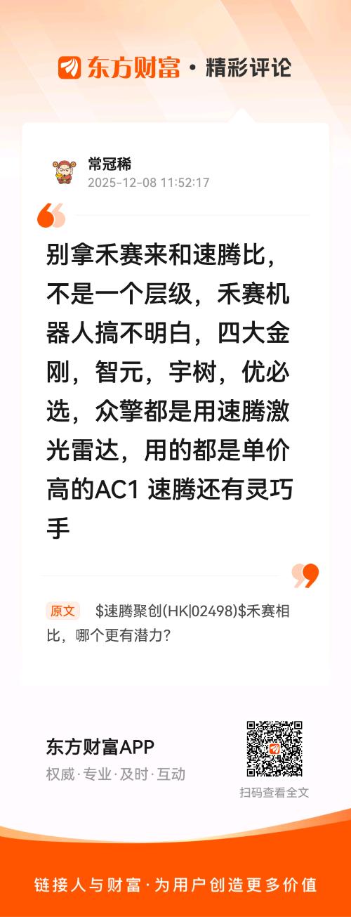 //@常冠稀 :别拿禾赛来和速腾比,不是一个层级,禾赛机器人搞不明白,四大金刚,智元,宇树,优必选,众擎都是用速腾激光雷达,用的都是单价高的AC1 速腾还有灵巧手