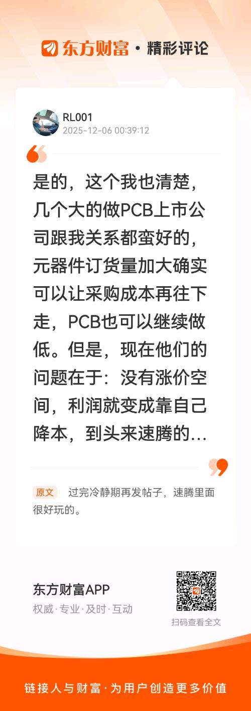 //@RL001 :是的,这个我也清楚,几个大的做PCB上市公司跟我关系都蛮好的,元器件订货量加大确实可以让采购成本再往下走,PCB也可以继续做低。但是,现在他们的问题在于:没有涨价空间,利润就变成靠自己降本,到头来速腾的上游也不好过,除非学华强北贸易商做进口货死活不降价。但是存在一个上海的公司打价格战。(这里多扯淡几句)且上海那家公司的表很怪!真的很怪。整车厂是不可能给那么高的毛利的,即便是特斯拉的供应商也很难拿到30%的毛利。长城明年一季度要上新的智驾系统(更新迭代),全速腾,根本不给上海友商机会的。即便是吉利系或比亚迪系,速腾与禾赛的占比是80%比20%。盖世汽车的统计数据不准(这个可以问上海友商,问速腾,再做交叉对比,盖世用的是销量和上险来反推)。所以友商的报表很迷!甚至我怀疑上海友商和小米老大是关系户的那种关系(纯猜测,无证据)。