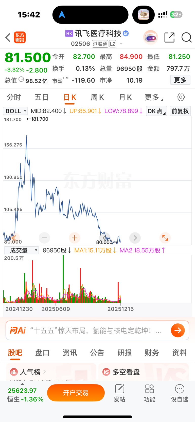 $讯飞医疗科技(HK|02506)$ 每一根大红柱后面股价都要向下腰斩