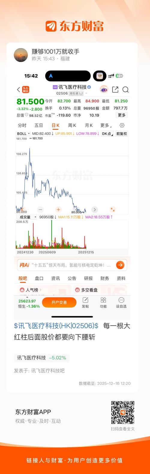 $讯飞医疗科技(HK|02506)$  每一根大红柱后面股价都要向下腰斩
