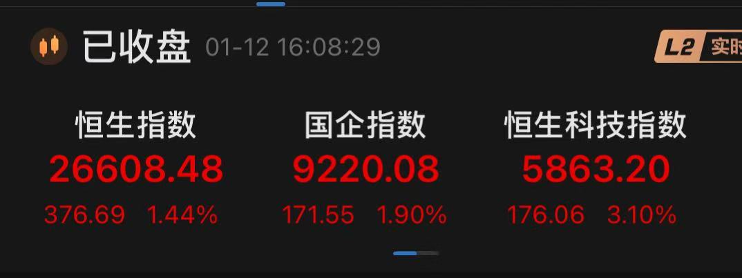 上证报中国证券网讯1月12日,AI概念股全线爆发,带动港股人气回升,三大指数全部收涨。截至收盘,恒生指数涨1.44%,报26608.48点;恒生国企指数涨1.90%,报9220.08点;恒生科技指数涨3.10%,报5863.20点。