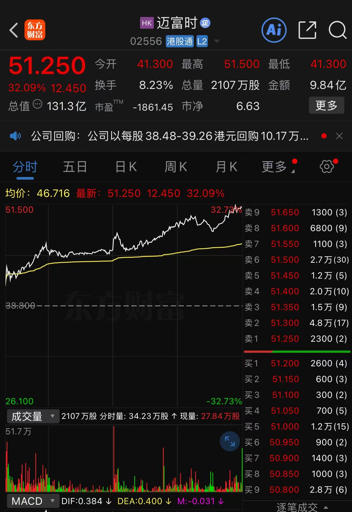 1月12日,迈富时大幅上涨超32%。截至收盘,迈富时涨32.09%,报51.25港元/股,创近3个月新高,总市值约131.3亿港元。