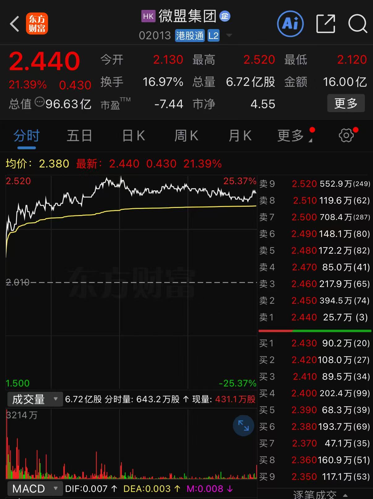 1月12日,微盟集团也迎来了久违的放量大涨行情。截至收盘,微盟集团涨21.39%,报2.44港元/股,成交额约16亿港元。