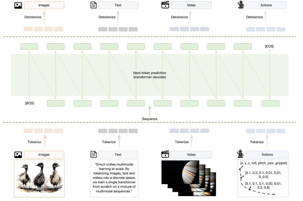 此前,语言大模型依托“预测下一个词元(NTP)”的自回归路线实现重大突破,但多模态模型仍依赖对比学习、扩散模型等专用路线,自回归能否成为多模态通用路线一直是行业未解之谜。智源团队提出的Emu3模型,将文本、图像、视频统一离散化到同一表示空间,基于单一Transformer架构从零开始联合训练,仅凭“预测下一个词元”就实现了多模态生成与感知的统一。