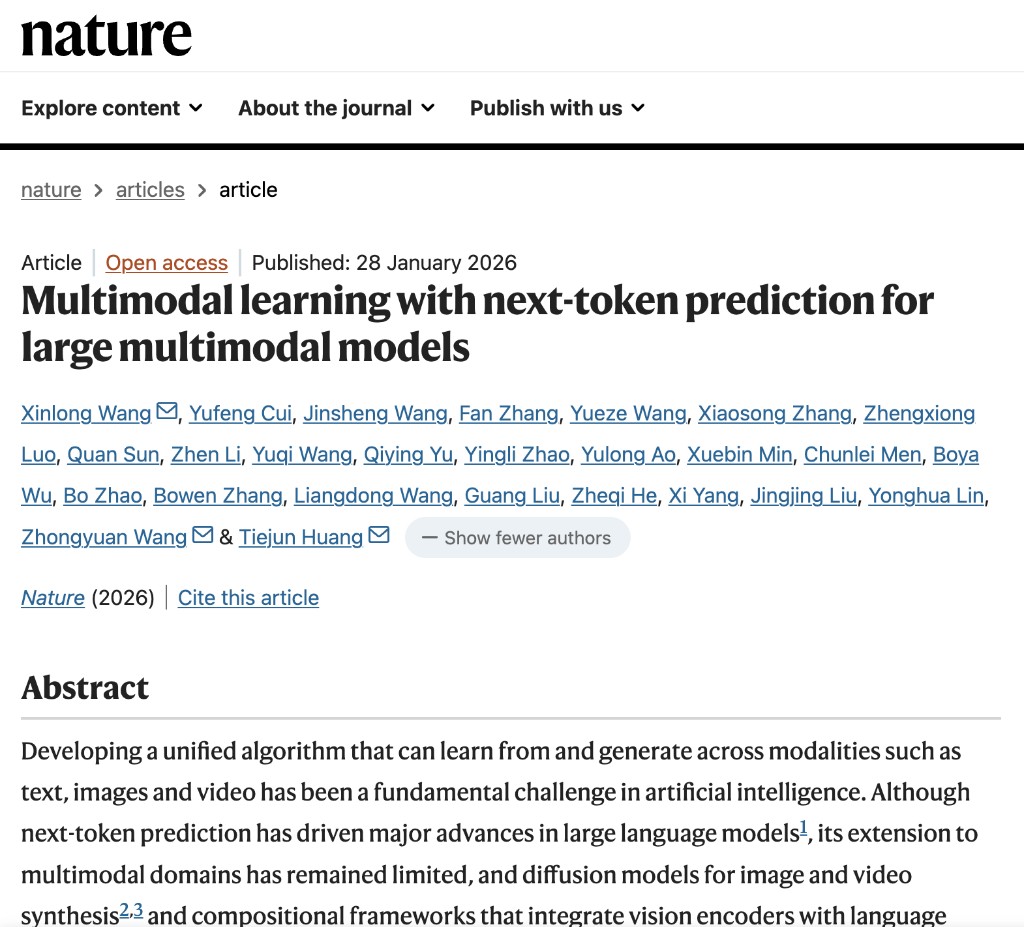 1月28日,北京智源研究院主导的多模态大模型成果“Emu3”正式上线国际顶级学术期刊《自然》正刊(纸质版预计将于2月12日刊发),这是我国科研机构主导的大模型成果首次登陆该期刊,标志着我国在人工智能原始创新领域取得重大突破。