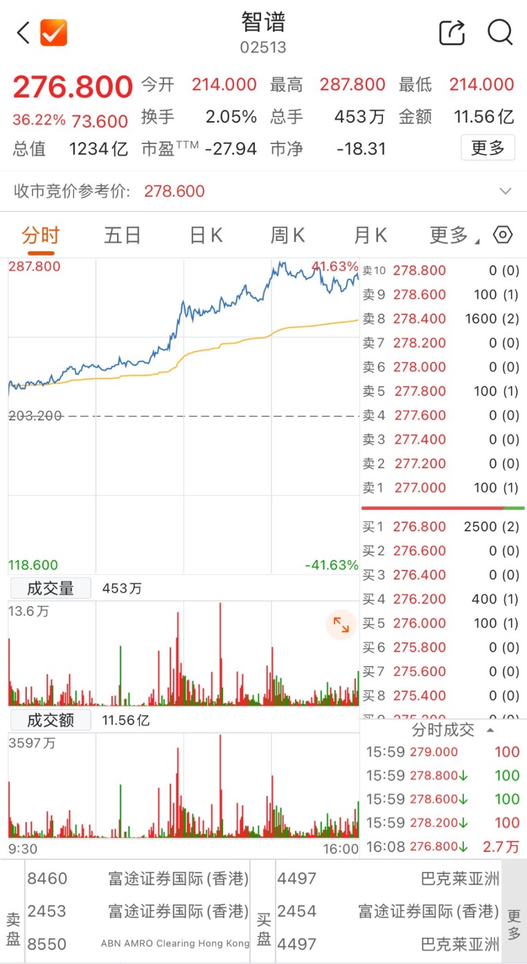 2月9日,智谱午后持续走强,盘中一度涨超40%。截至收盘,智谱涨超36%,报276.8港元/股,市值站上1200亿港元,再创新高。