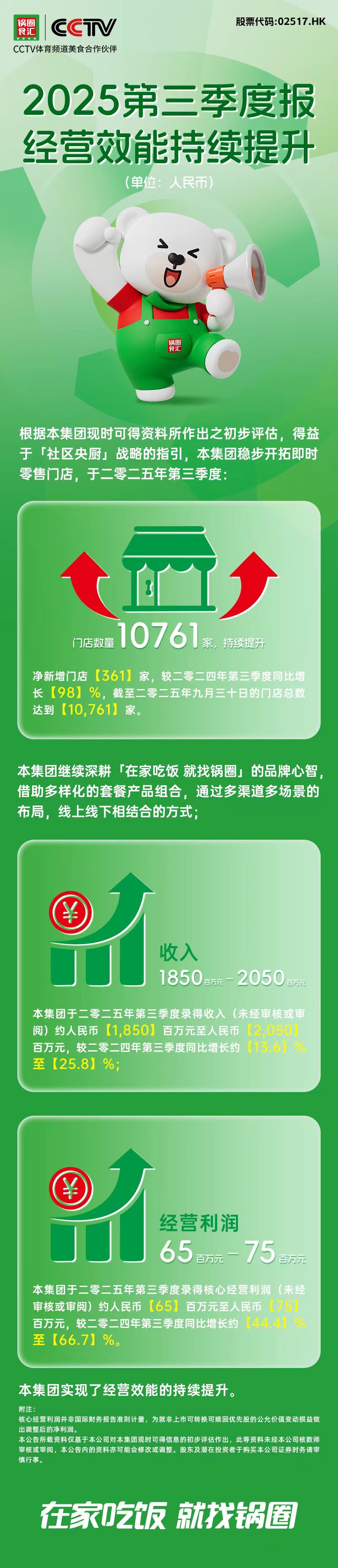 2025年第三季度,锅圈净新增门店361家,较2024年同期大幅增长98%。截至2025年9月30日,门店总数达到10,761家,创下历史新高。期内,锅圈预计实现营业收入约人民币18.50亿元至20.50亿元,同比增长约13.6%至25.8%;预计实现核心经营利润约人民币6,500万元至7,500万元,同比增长约44.4%至66.7%。随着经营效能持续提升,锅圈展现出强劲的成长动能与稳健的盈利能力。