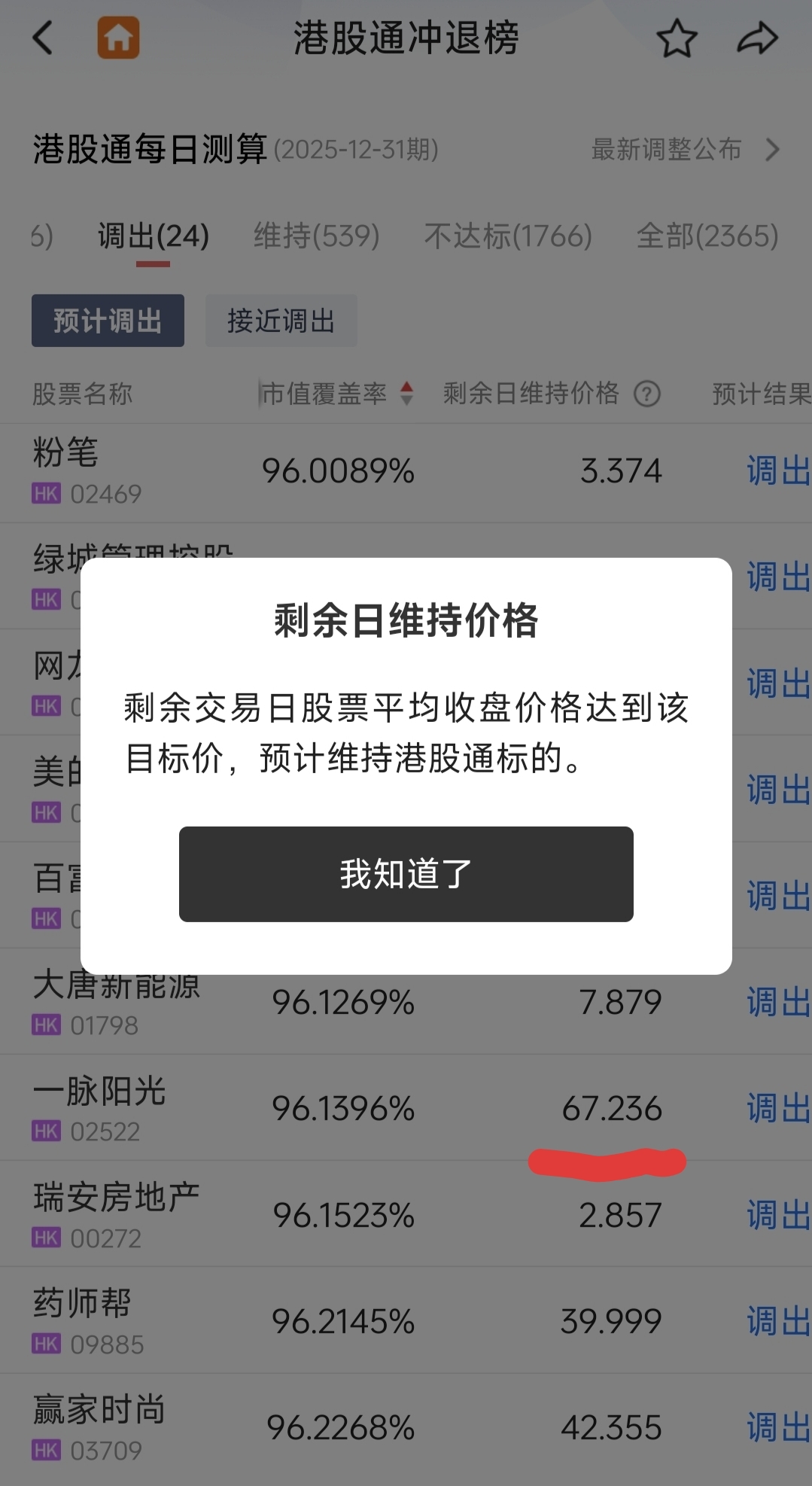 $一脉阳光(HK|02522)$ 12月31前剩下几个交易日,港股圣诞节还少了两个半交易日,差不多还有5个半交易日的样子,需要每天维持60多块钱的股价才能在3月份不退出港股通,神仙都保不住。这是经过科学计算的,神仙也无法避免,除非港股通规则改变。