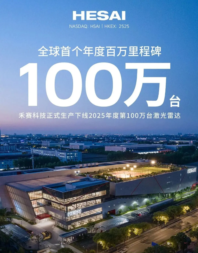 禾赛科技宣布其年度第100万台激光雷达已于9月底正式下线,也因此成为全球首个年产