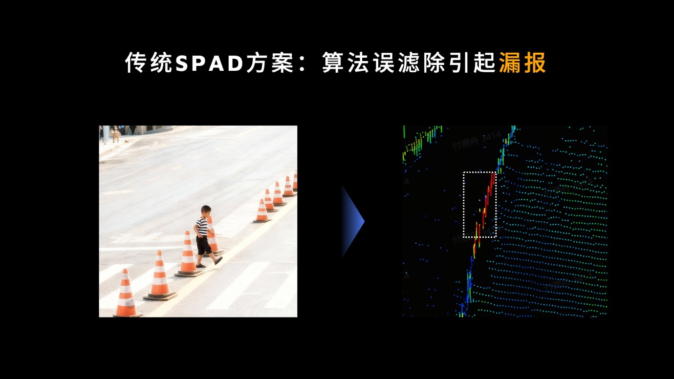 严重漏报:过马路的行人因为站在高反物体旁,被传统 SPAD 激光雷达误滤除