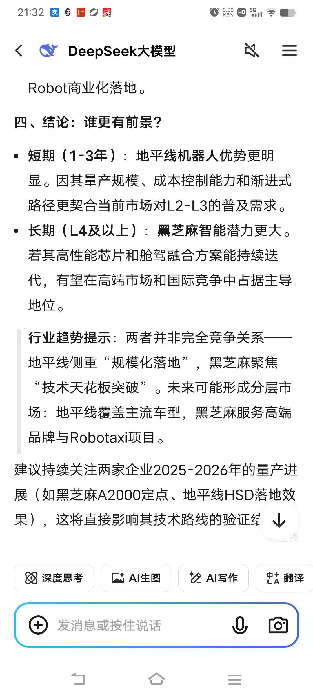 $黑芝麻智能(HK|02533)$ 虽然我同时持有黑芝麻和地平线,但我个人认为黑芝麻虽然暂时落后于地平线,但从两个公司智驾技术路线来分析,黑芝麻更有前景。deepssek也是这样认为的。