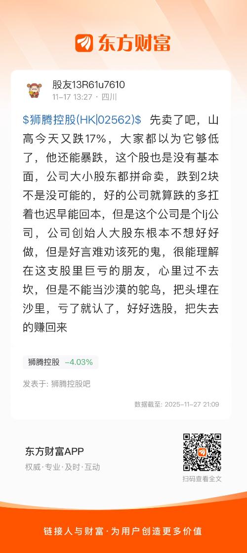 $狮腾控股(HK|02562)$ 先卖了吧,山高今天又跌17%,大家都以为它够低了,他还能暴跌,这个股也是没有基本面,公司大小股东都拼命卖,跌到2块不是没可能的,好的公司就算跌的多扛着也迟早能回本,但是这个公司是个lj公司,公司创始人大股东根本不想好好做,但是好言难劝该死的鬼,很能理解在这支股里巨亏的朋友,心里过不去坎,但是不能当沙漠的鸵鸟,把头埋在沙里,亏了就认了,好好选股,把失去的赚回来
