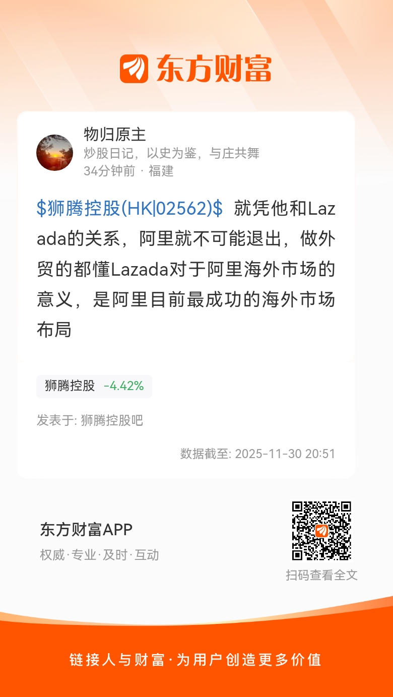 $狮腾控股(HK|02562)$ 就凭他和Lazada的关系,阿里就不可能退出,做外贸的都懂Lazada对于阿里海外市场的意义,是阿里目前最成功的海外市场布局