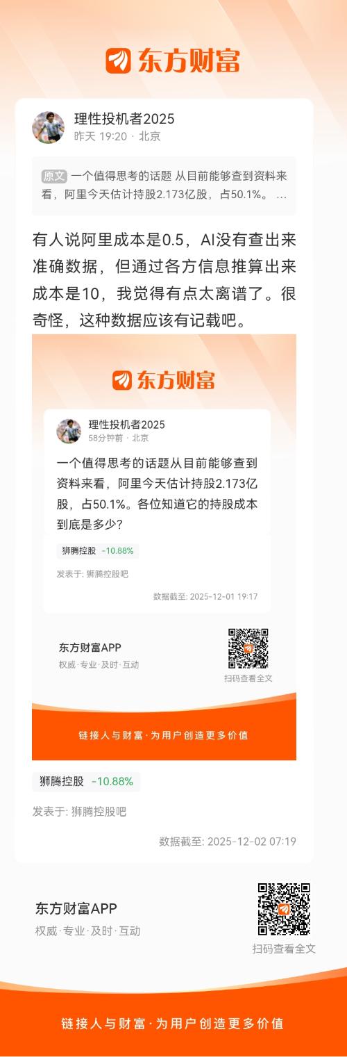 昨天的走法只能说是资金的态度了。目前能确定阿里的入股成本是1.37,持有快五年了,加上财务成本等,目前这个价格对于阿里说利润空间很大也说不上,继续观察后面的减持情况//@理性投机者2025 :有人说阿里成本是0.5,AI没有查出来准确数据,但通过各方信息推算出来成本是10,我觉得有点太离谱了。很奇怪,这种数据应该有记载吧。