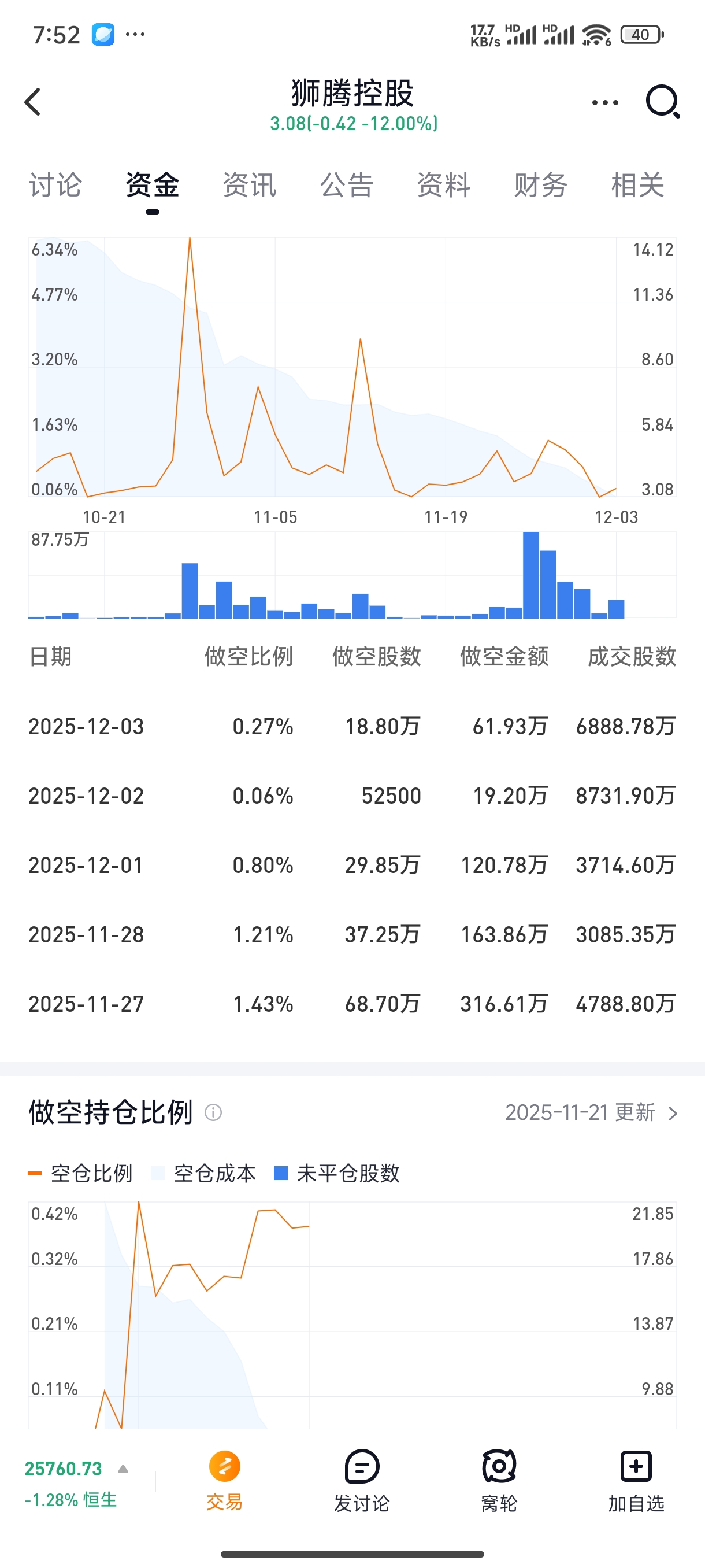 $狮腾控股(HK|02562)$ 这个股真的看不懂!股东清仓大甩卖!为什么没有资金做空,一面是股价连续大跌,一面是只有极少资金做空!有外资账户的做空赚好几倍了!看不懂的就远离,加今天抄底3次,前两次是一胜一败,今天就3.25抄底了3万股,目前总共还有500利润,本来计划破3再加3万股的,目前计划不加了!