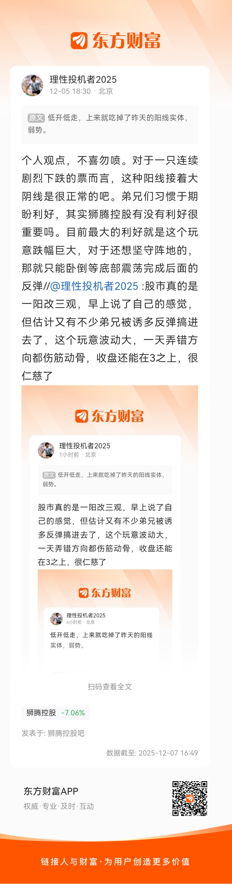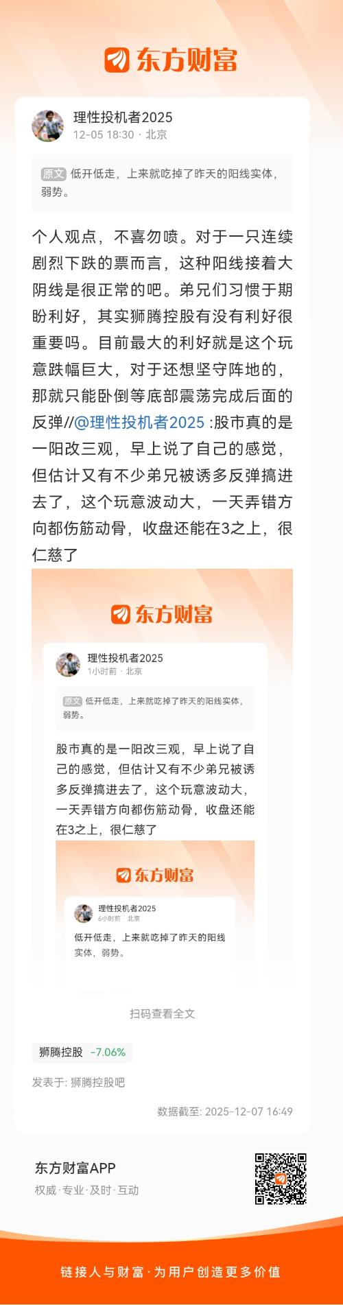 明天要是高开了,追不追呢…//@理性投机者2025 :个人观点,不喜勿喷。对于一只连续剧烈下跌的票而言,这种阳线接着大阴线是很正常的吧。弟兄们习惯于期盼利好,其实狮腾控股有没有利好很重要吗。目前最大的利好就是这个玩意跌幅巨大,对于还想坚守阵地的,那就只能卧倒等底部震荡完成后面的反弹//@理性投机者2025 :股市真的是一阳改三观,早上说了自己的感觉,但估计又有不少弟兄被诱多反弹搞进去了,这个玩意波动大,一天弄错方向都伤筋动骨,收盘还能在3之上,很仁...