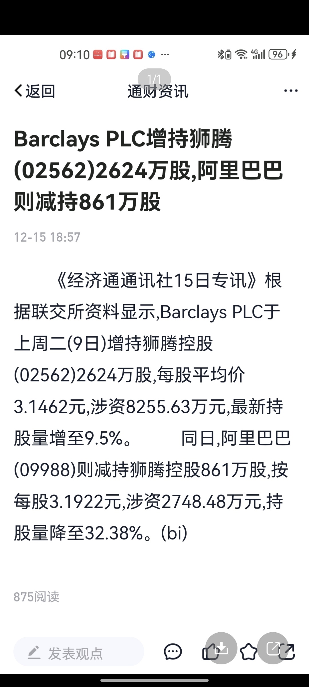 $狮腾控股(HK|02562)$ 按照这个报道,新加坡阿里昨天才是第一次减持,861万股,持股占比从34%降为32.38%。