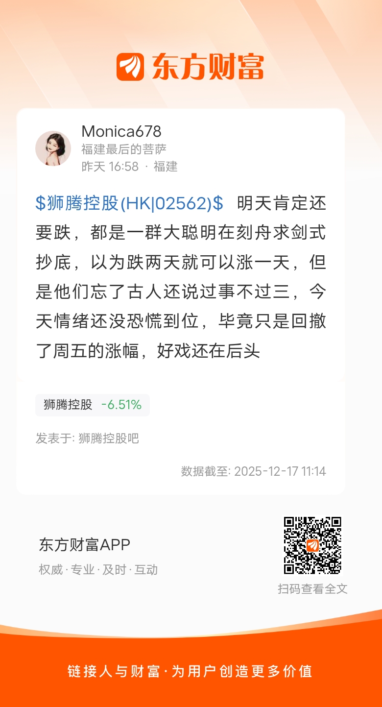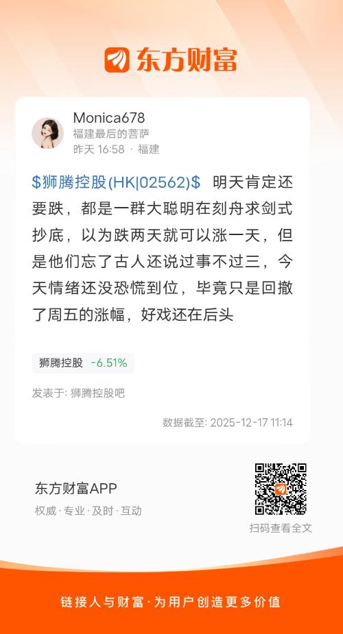 $狮腾控股(HK|02562)$ 明天肯定还要跌,都是一群大聪明在刻舟求剑式抄底,以为跌两天就可以涨一天,但是他们忘了古人还说过事不过三,今天情绪还没恐慌到位,毕竟只是回撤了周五的涨幅,好戏还在后头