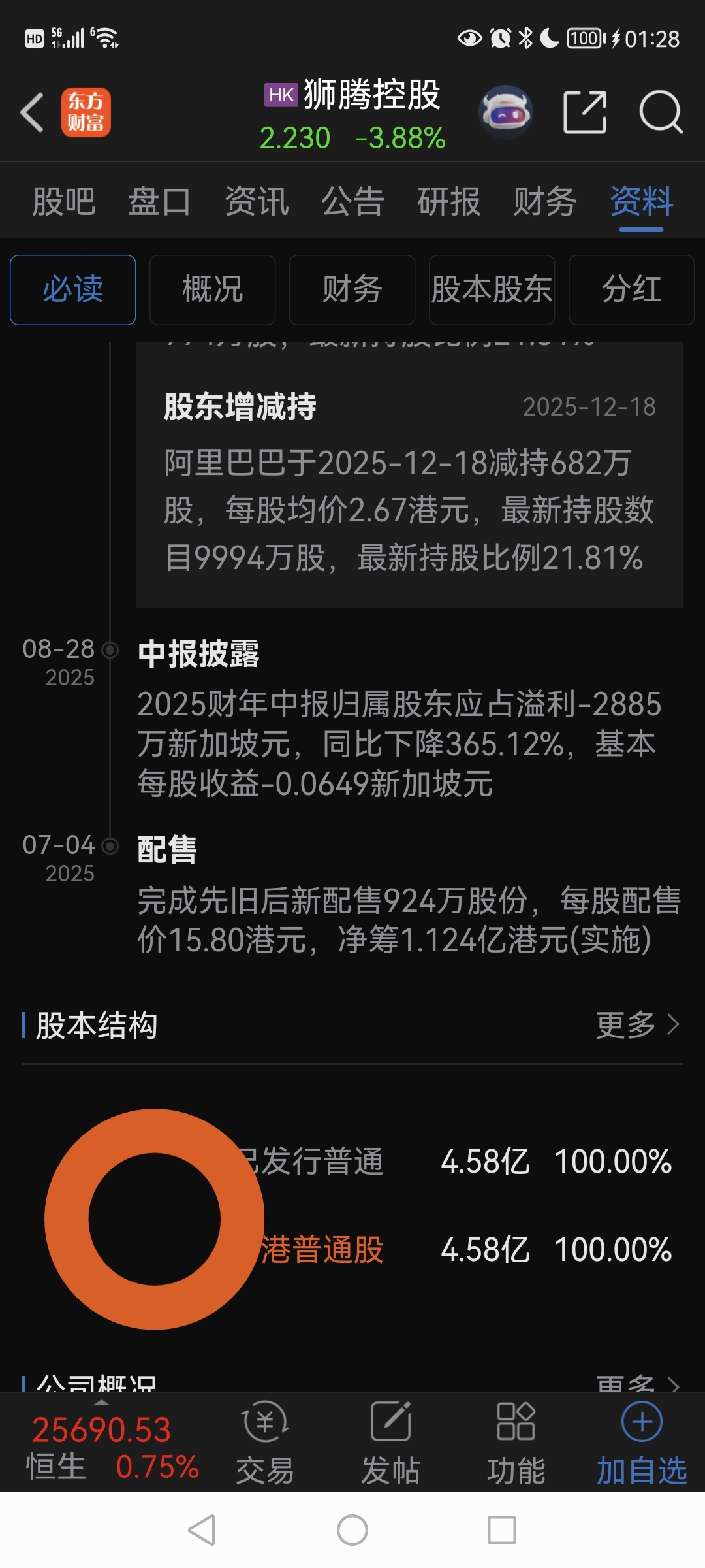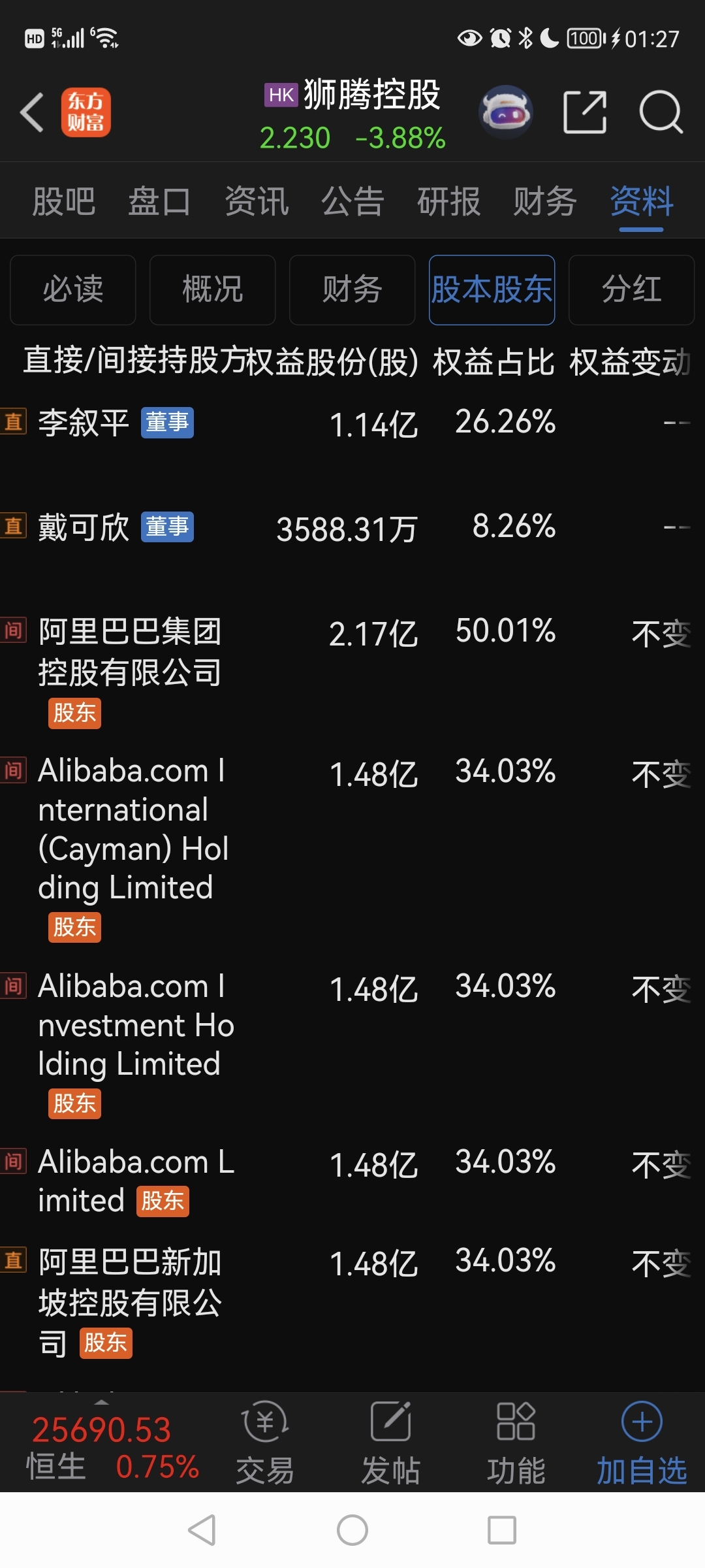 $狮腾控股(HK|02562)$ 阿里巴巴2024年底持股2.17亿,占总股本比例50%,2025年12月18日公告减持后目前持股9994万股,占比锐减至21%。为什么阿里巴巴要持续减持?目前价位阿里巴巴持股市值仅值2亿元,18日那天减持了六百多万股,价值1300多万元,阿里巴巴缺这点碎银子?太古怪了,关键是这些大佬都在疯狂减仓,这到底是有什么重大还是特大利空消息不为人知?