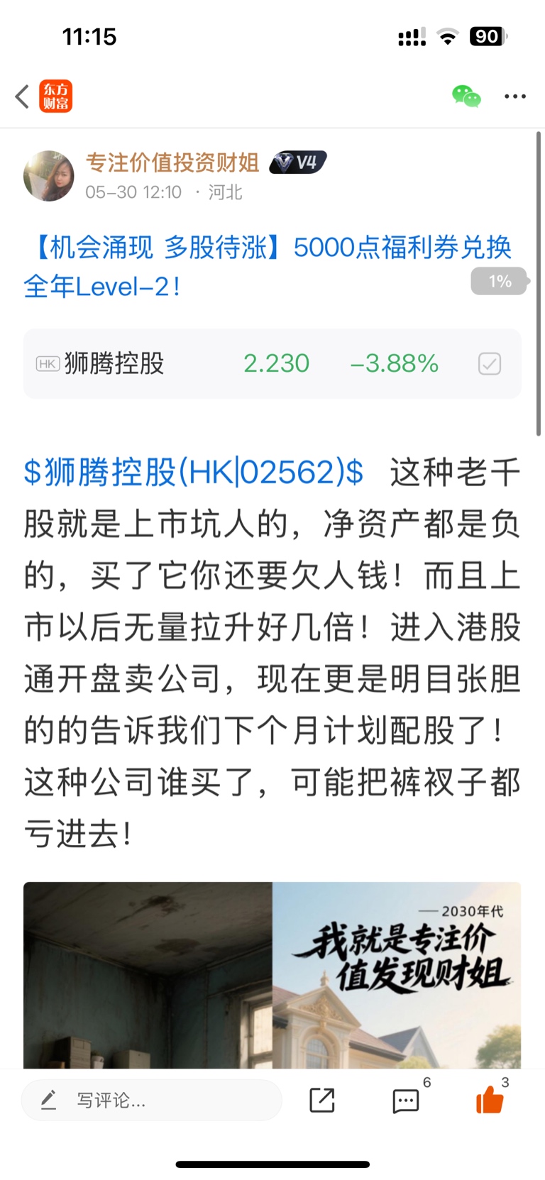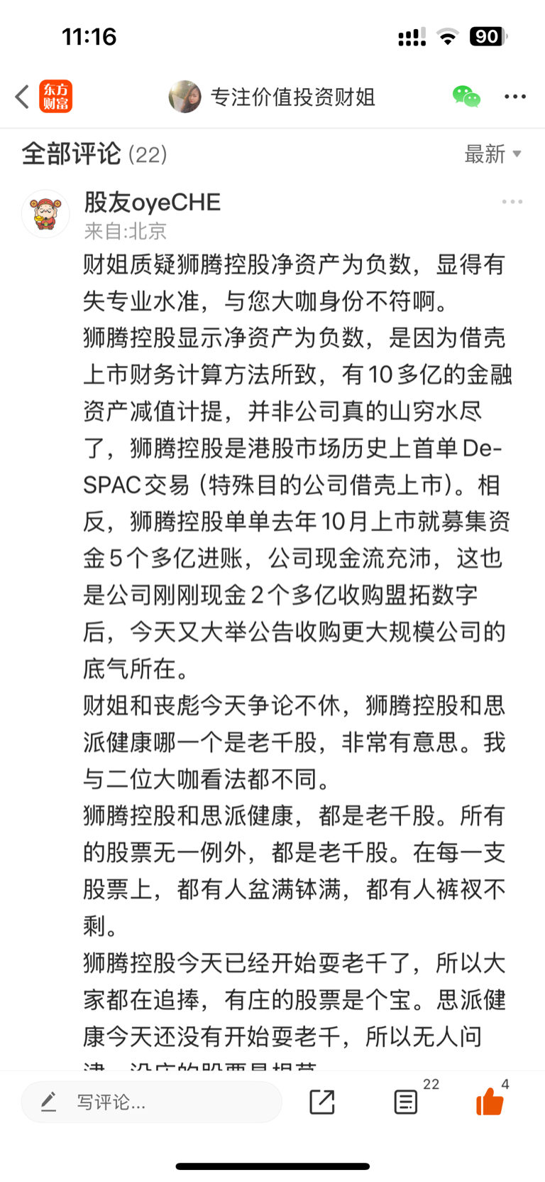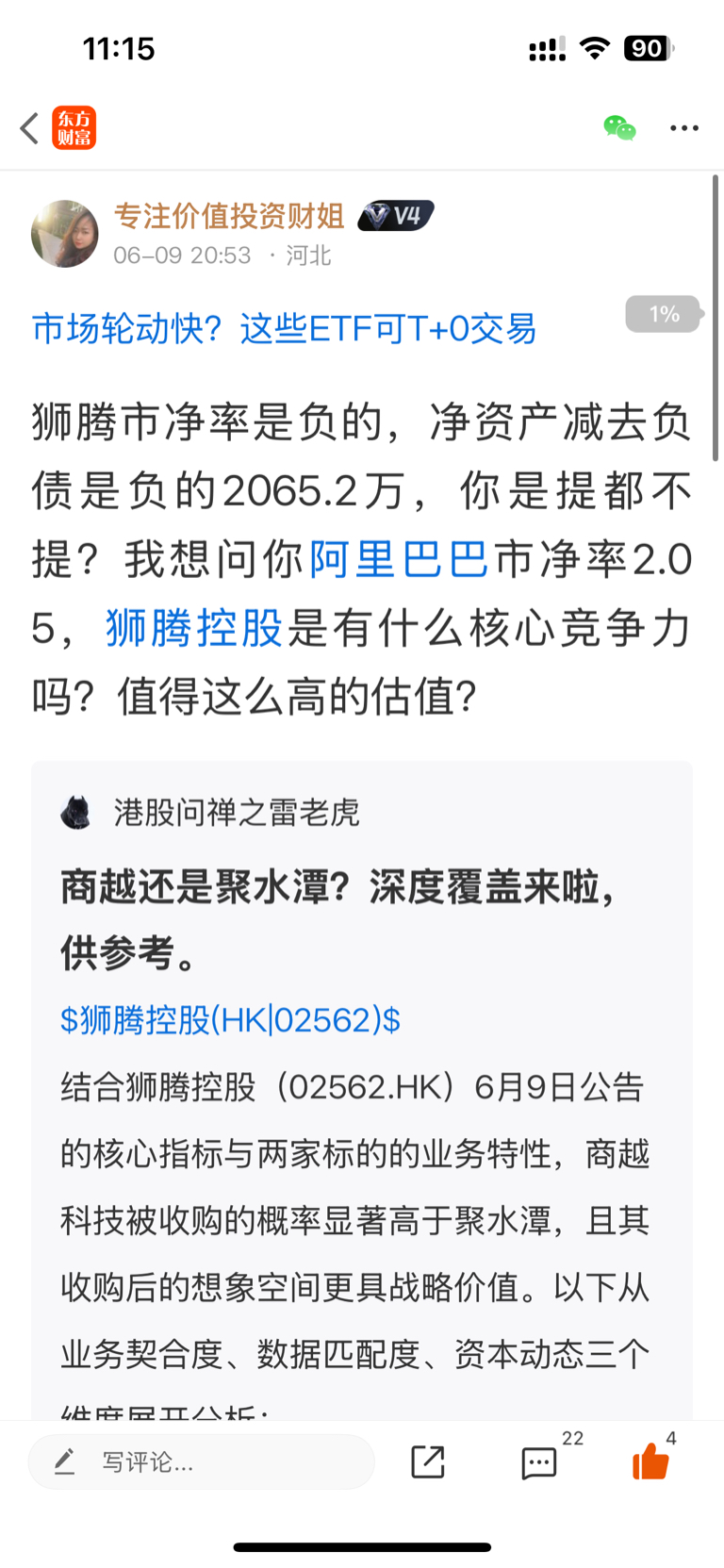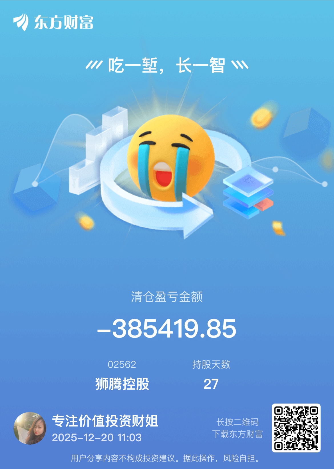 $狮腾控股(HK|02562)$ 财姐割肉了!你们赶紧给狮腾填坑吧!阿里卖不完是不可能有反弹的!这是无底洞,一路下跌,全靠拟收购画饼!我还想顺我拟称为世界首富呢!