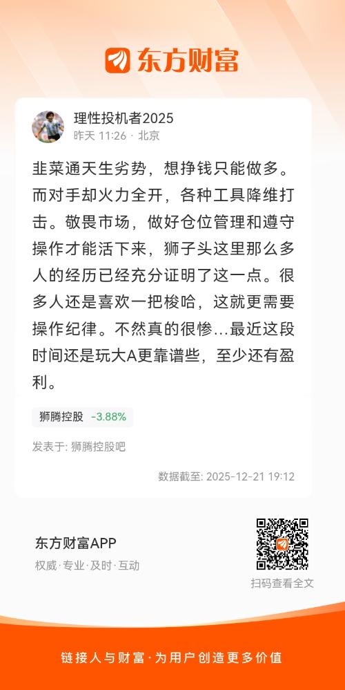 韭菜通天生劣势,想挣钱只能做多。而对手却火力全开,各种工具降维打击。敬畏市场,做好仓位管理和遵守操作才能活下来,狮子头这里那么多人的经历已经充分证明了这一点。很多人还是喜欢一把梭哈,这就更需要操作纪律。不然真的很惨…最近这段时间还是玩大A更靠谱些,至少还有盈利。