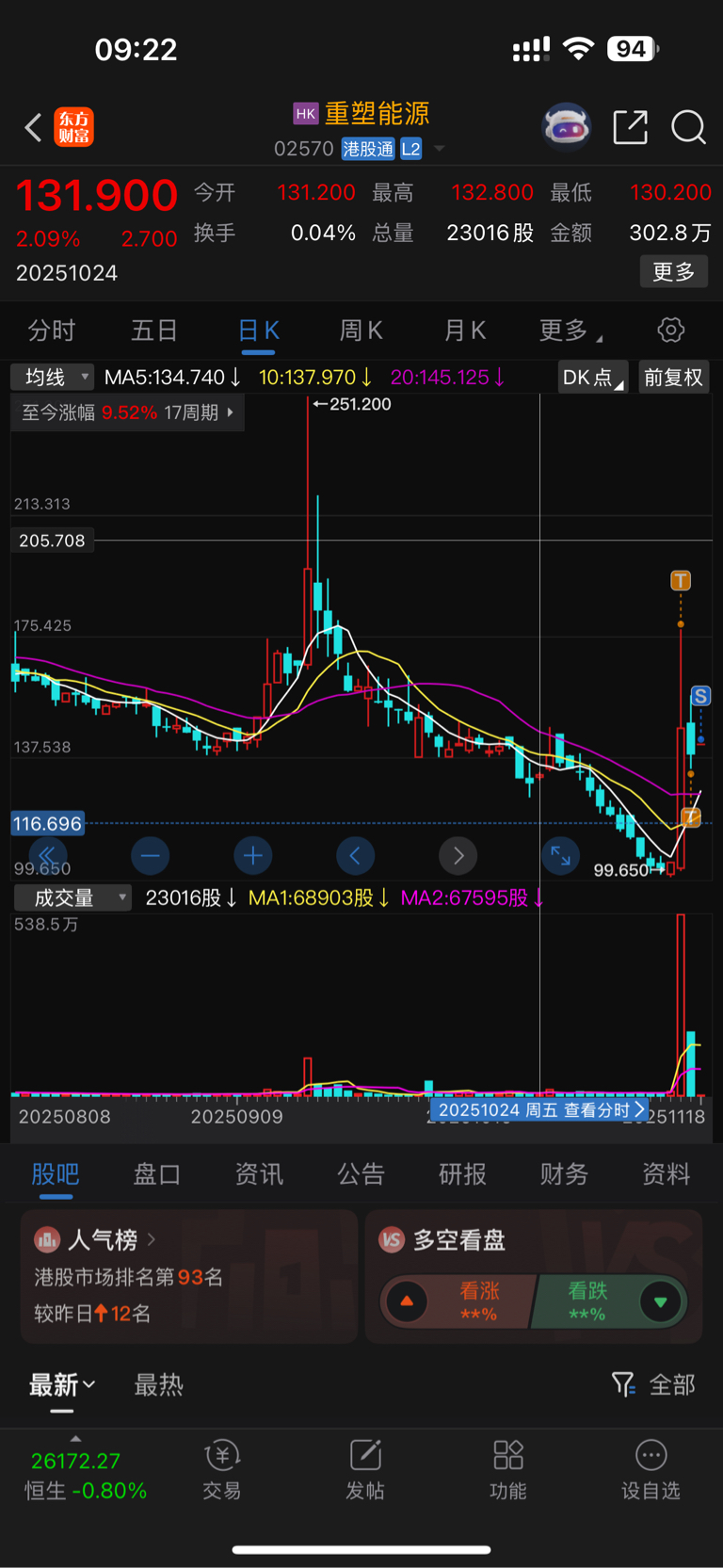 $重塑能源(HK|02570)$ 成本来到了116港元