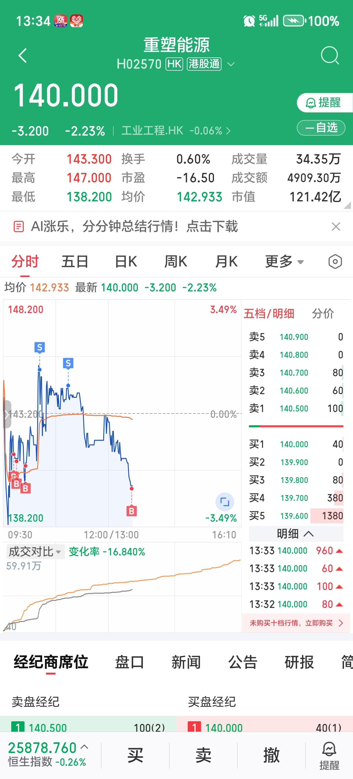 $重塑能源(HK|02570)$ 140又给机会了。赶紧下来这次138再买