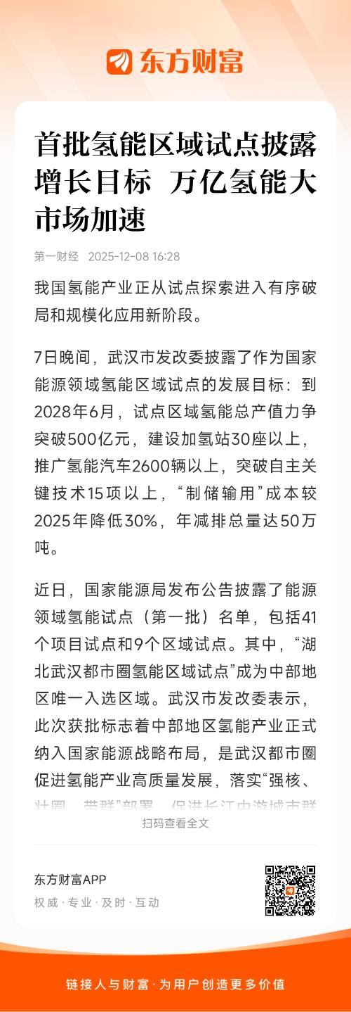 近日,国家能源局发布公告披露了能源领域氢能试点(第一批)名单,包括41个项目试点和9个区域试点。其中,“湖北武汉都市圈氢能区域试点”成为中部地区唯一入选区域。武汉市发改委表示,此次获批标志着中部地区氢能产业正式纳入国家能源战略布局,是武汉都市圈促进氢能产业高质量发展,落实“强核、壮圈、带群”部署、促进长江中游城市群协同发展的重要契机。